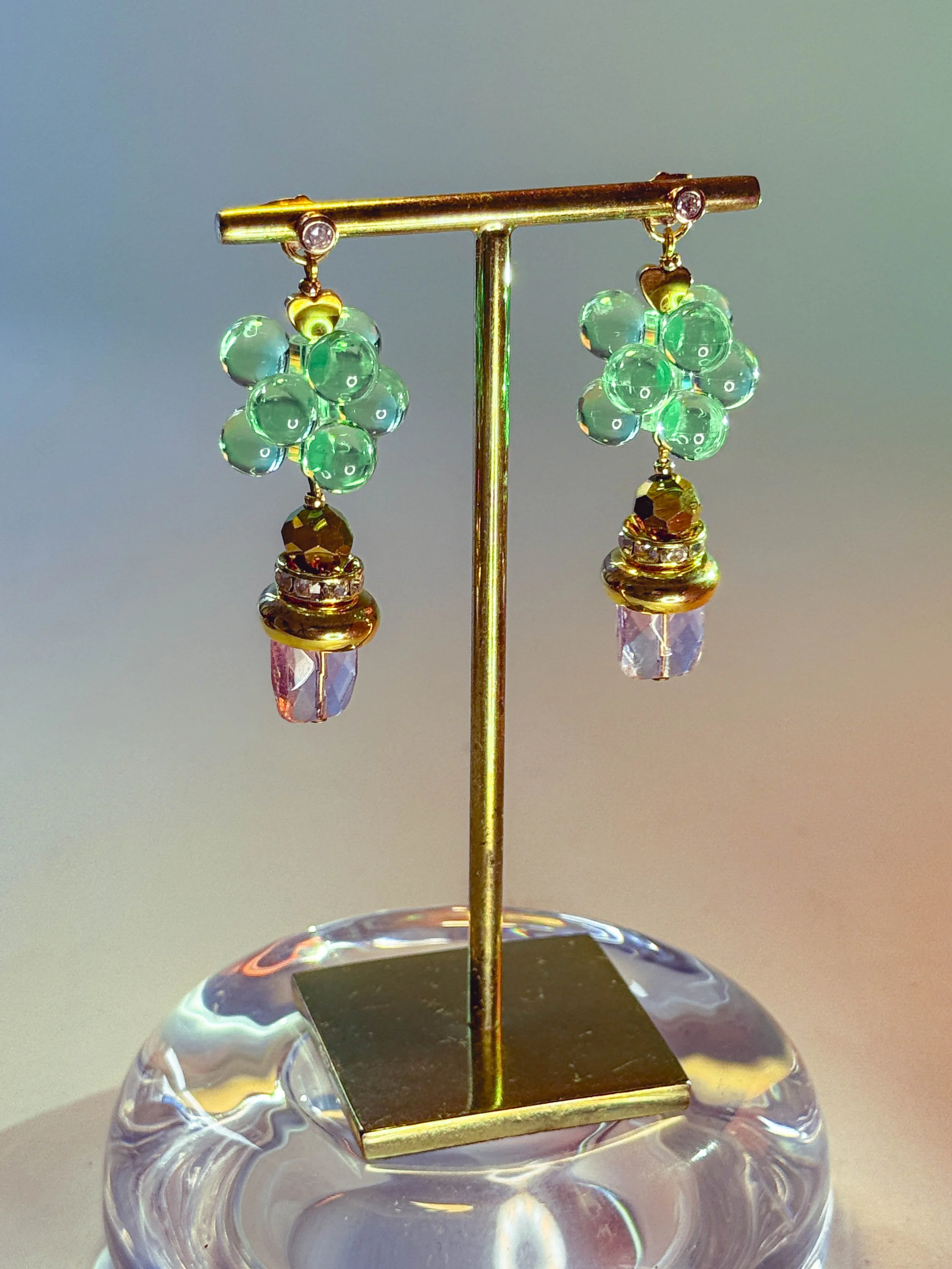 perle violet facetté nacré XL - coupelle dorée - coupelle dorée sertie de pierres blanches - fleur-raisin rose - cœur en hématite doré