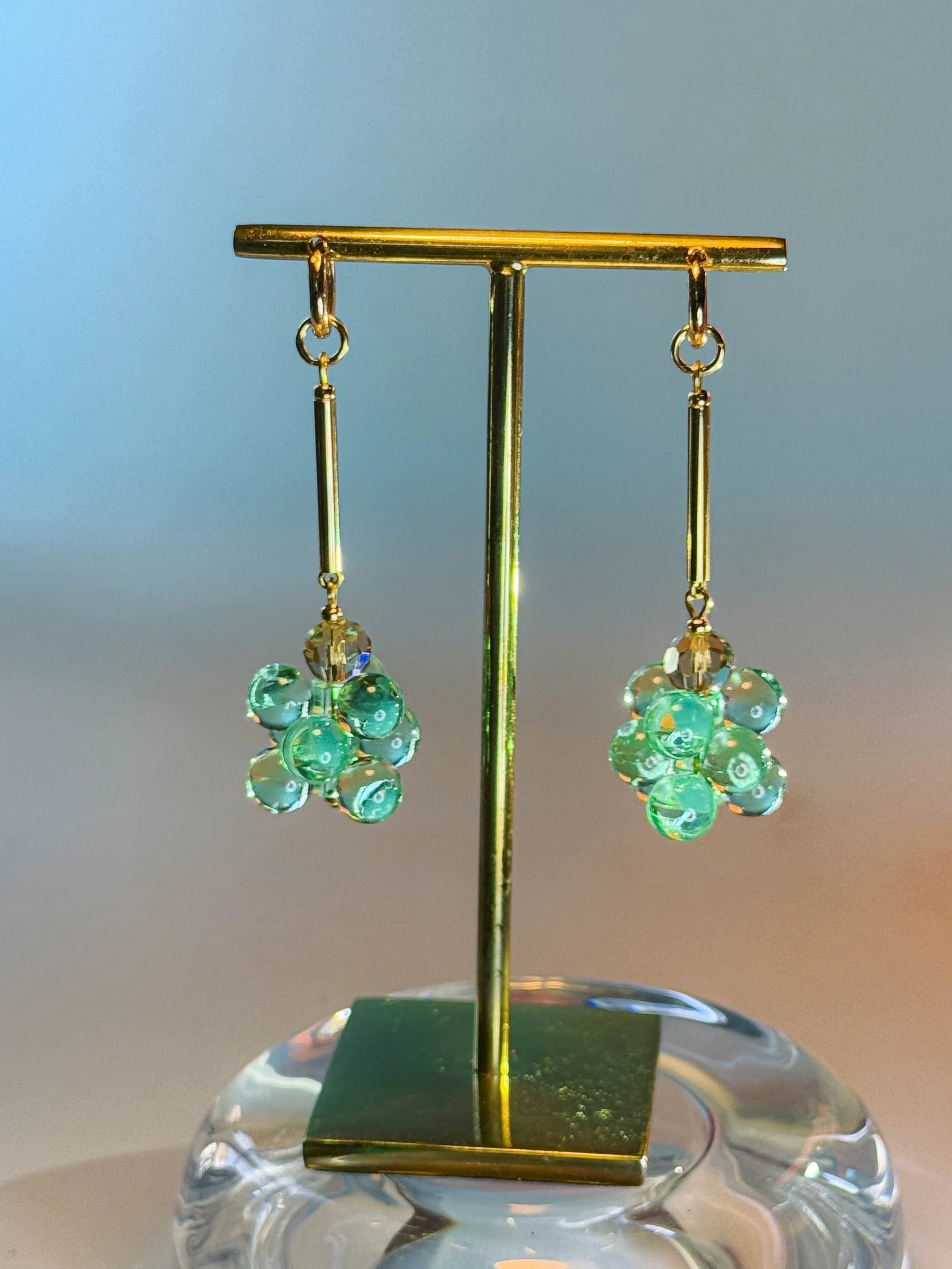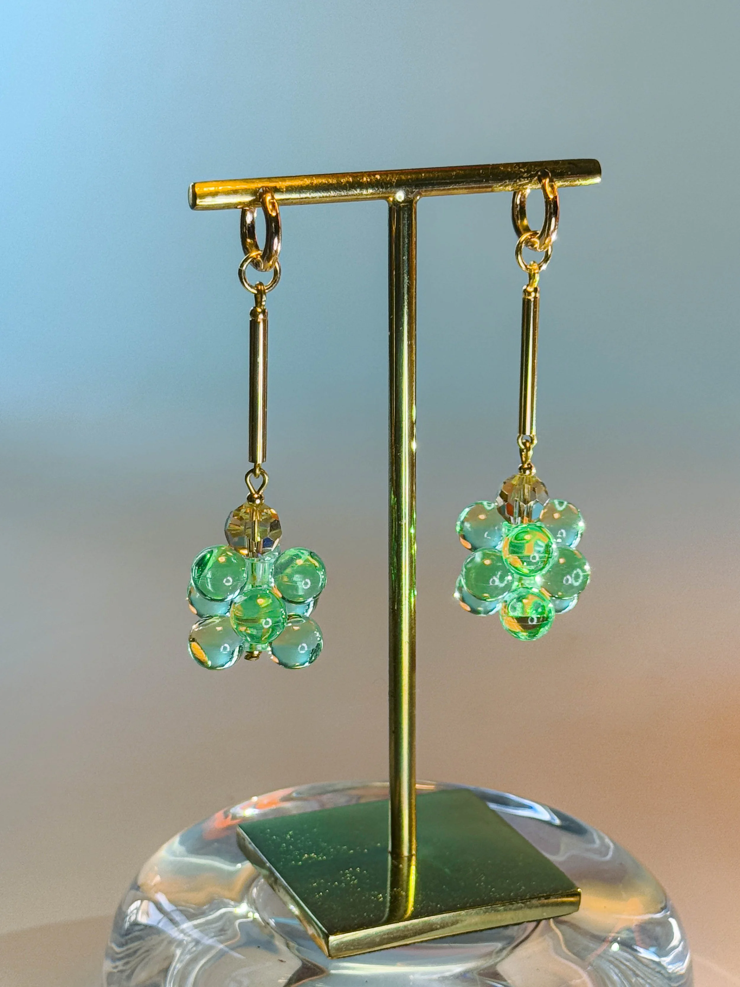 Boucles d’oreilles avec une fleur-raisin mobile en perles transparentes vertes montée sur une tige dorée avec une paire de créoles plaqué or 3 microns